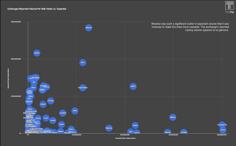 根据 TheTie 的一份报告,超过 86% 的比特币交易量是可疑的,而 75% 的交易所报告了非常可疑的交易量。例如,用户平均每次访问的价值为 13418 美元,预计 Bithumb 每月交易量应约为 12 亿美元,而 Bithumb 报告了超过 280 亿美元的交易量,这意味着他们报告的数值比预期的高出近 2,000% 。